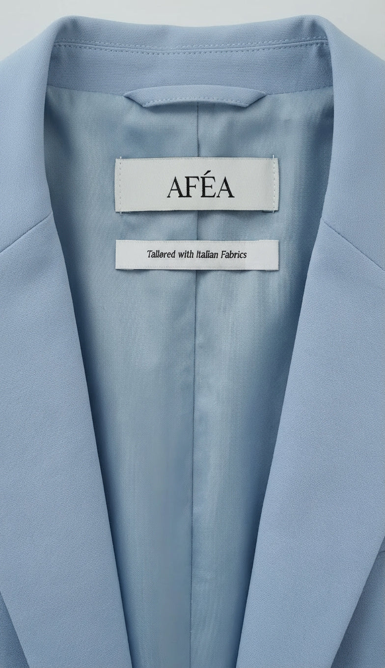 The Creator blazer is tailored to define the waist and shoulders with subtle precision. It enhances the feminine silhouette while maintaining a soft, expressive character. Premium interfacing gives it enduring structure, allowing the baby-blue fabric and delicate floral accents to stand out.